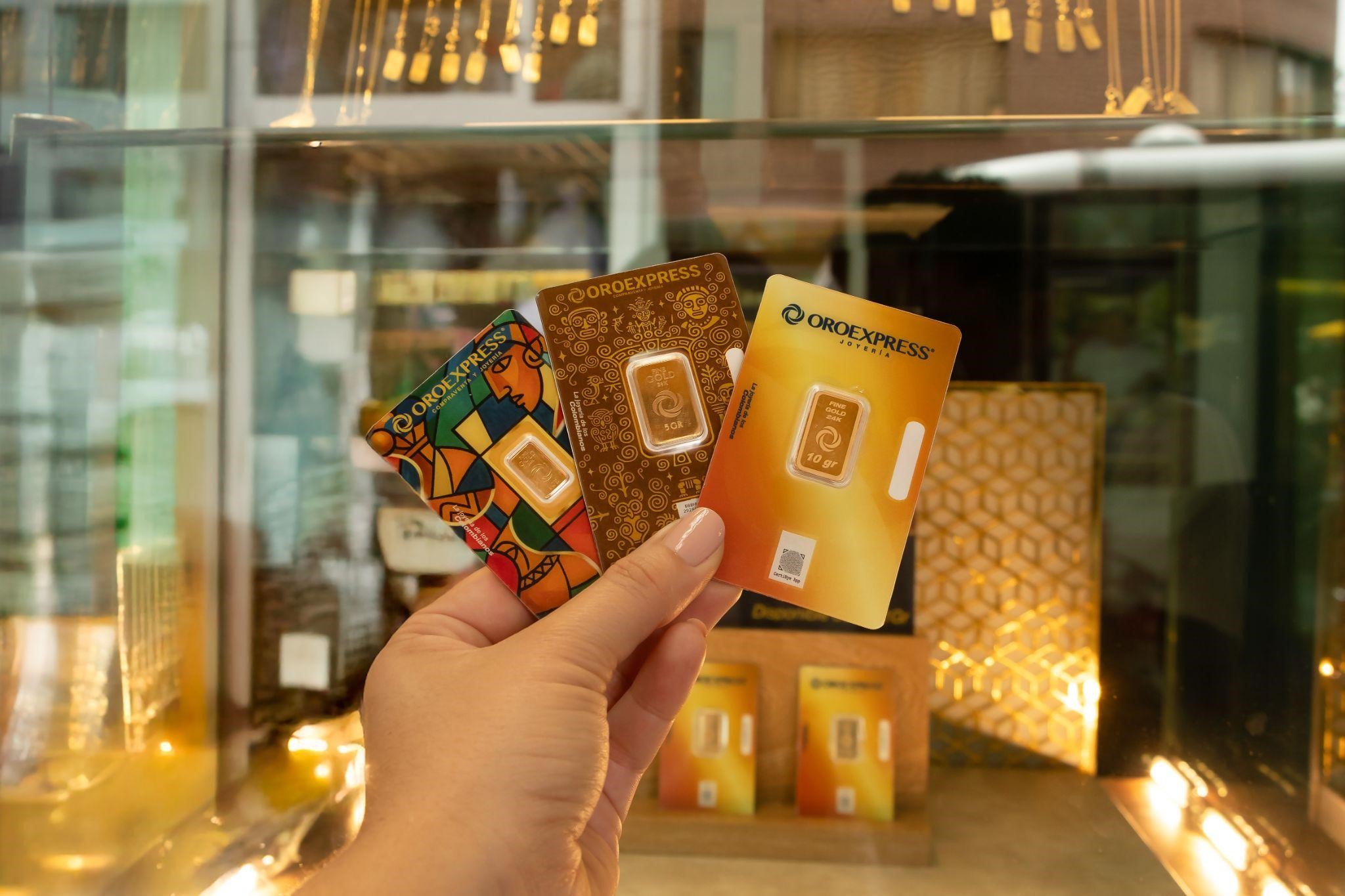 Compra lingotes de oro puro 24K en OROEXPRESS Colombia. Más de 43 años de experiencia, 190+ puntos físicos en 65 ciudades. Envíos a todo el país
