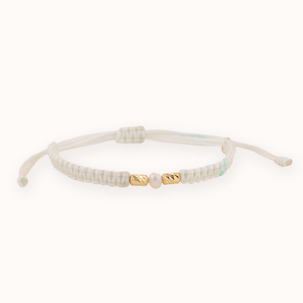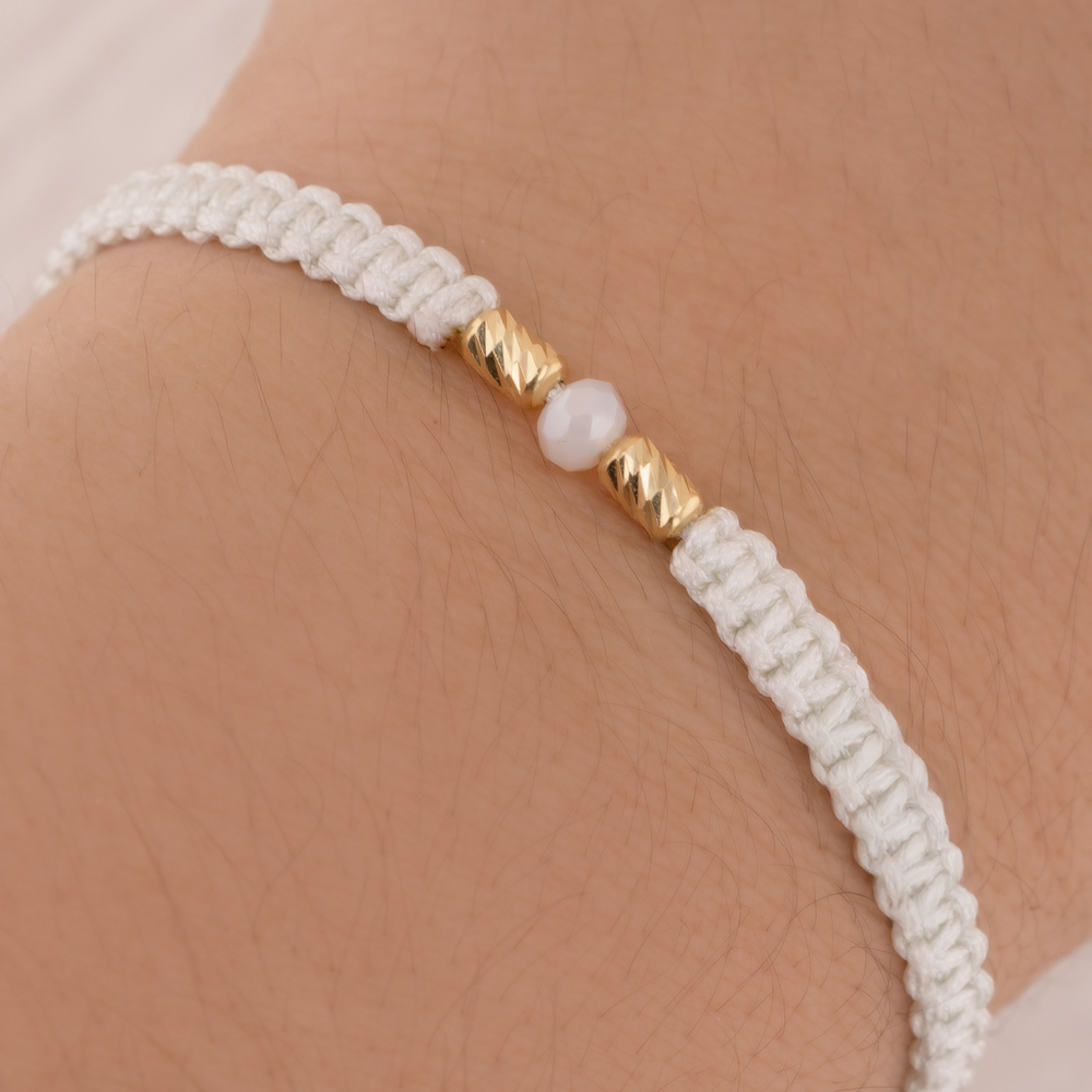 Delicada pulsera de oro 18K con 2 cilindros de 3×5 mm en hilo blanco, una joya que combina simplicidad, elegancia y estilo moderno. Su diseño minimalista resalta la belleza del oro fino junto con la suavidad del hilo blanco, símbolo de pureza, armonía y equilibrio.