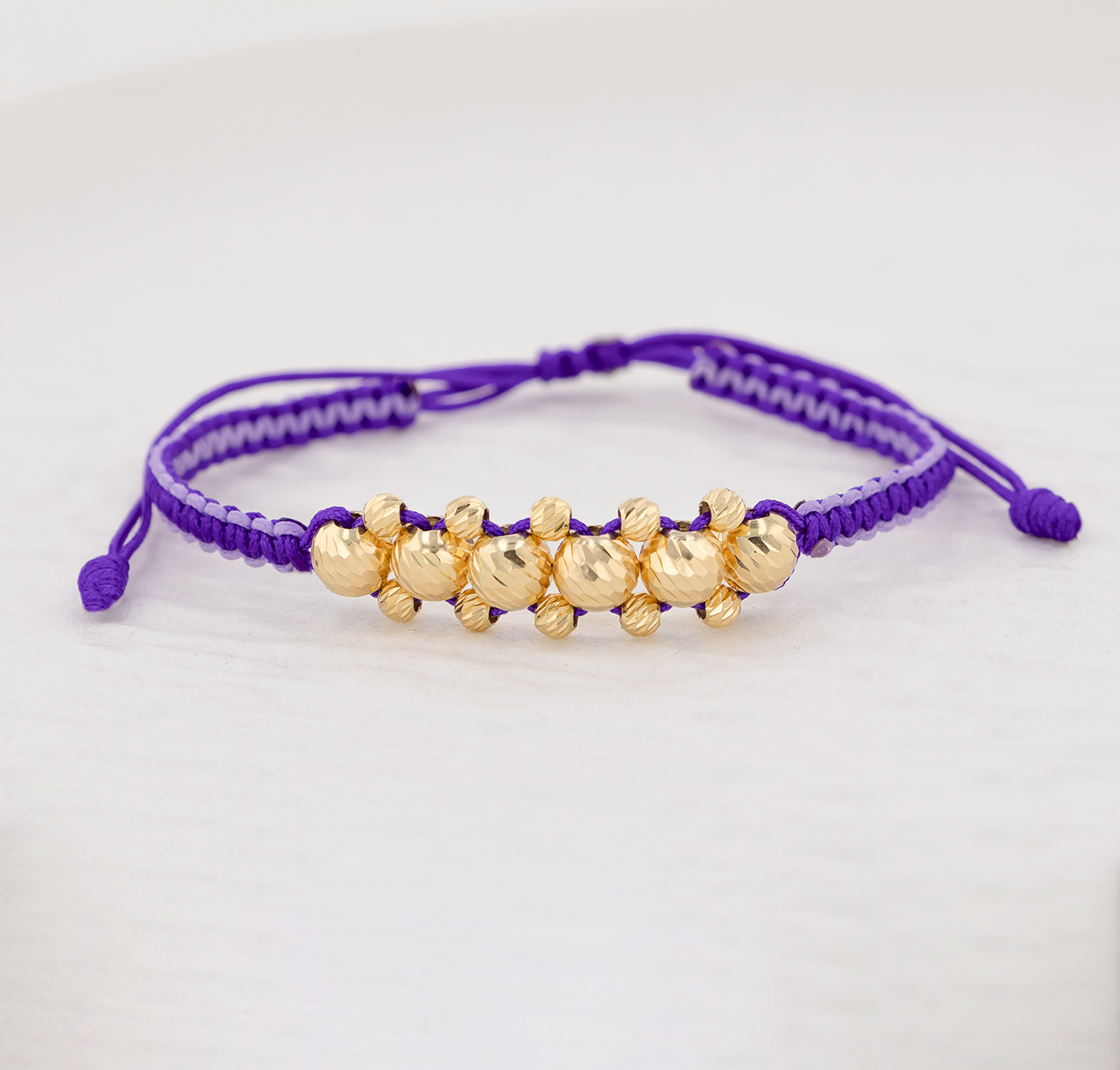 Una joya llamativa en oro 18k con seis esferas diamantadas de 6mm, tejida con hilo morado para un estilo único y elegante.