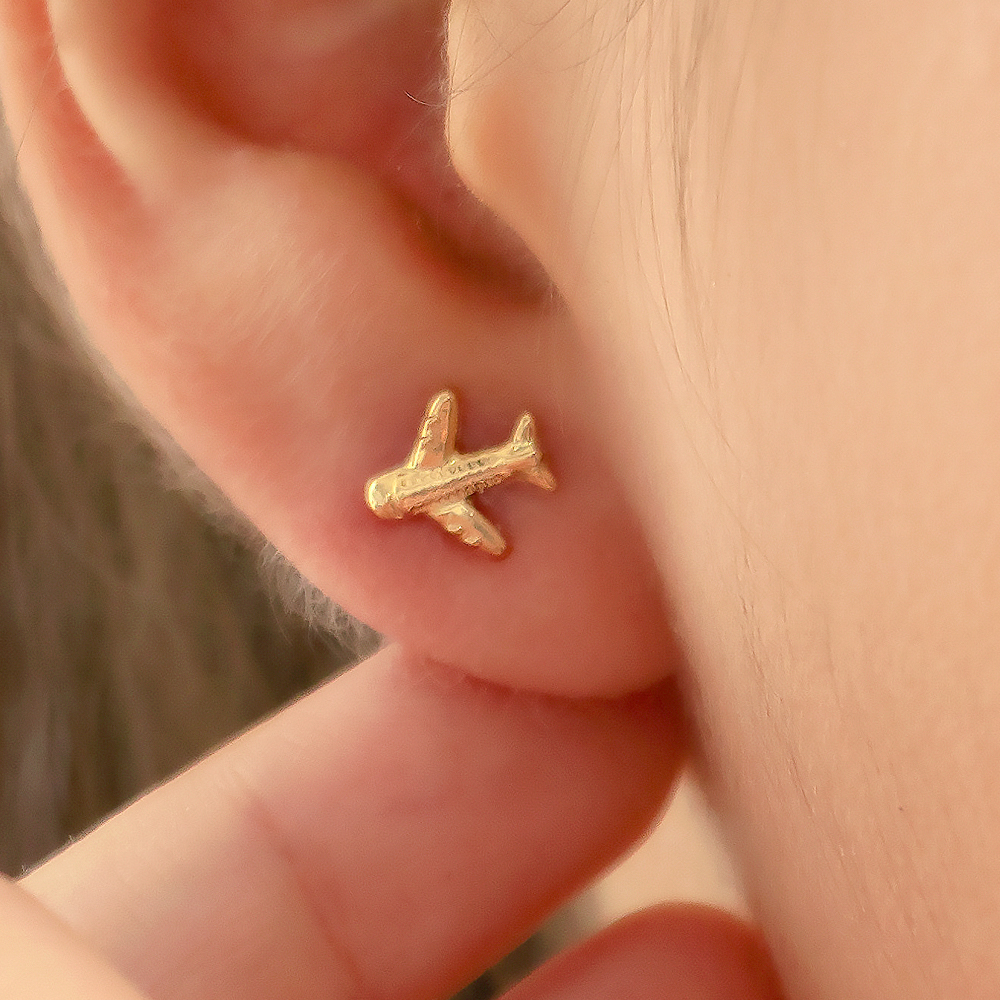 Delicados topos en oro de 18k con diseño de avión, ideales para quienes aman viajar o buscan un detalle único y moderno. Incluyen broche de seguridad para mayor comodidad.
