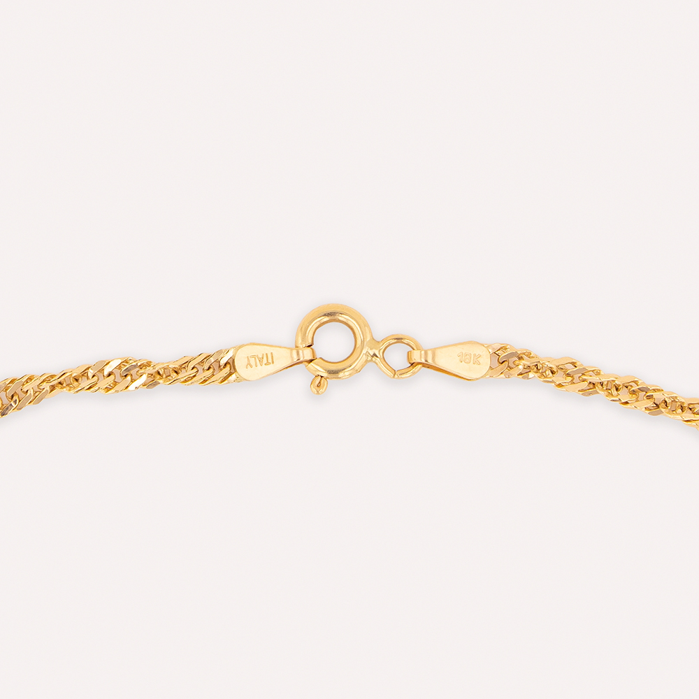 Elegante cadena de oro 18K tipo Singapur, reconocida por su diseño trenzado que refleja la luz de forma única, creando un brillo excepcional. Elaborada en oro de alta calidad, esta cadena combina sofisticación, resistencia y versatilidad, siendo ideal para uso diario o para acompañar dijes finos.