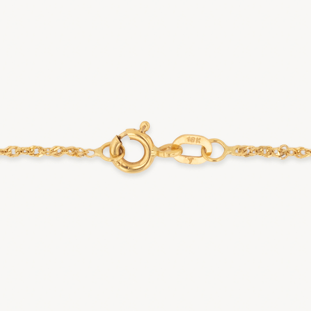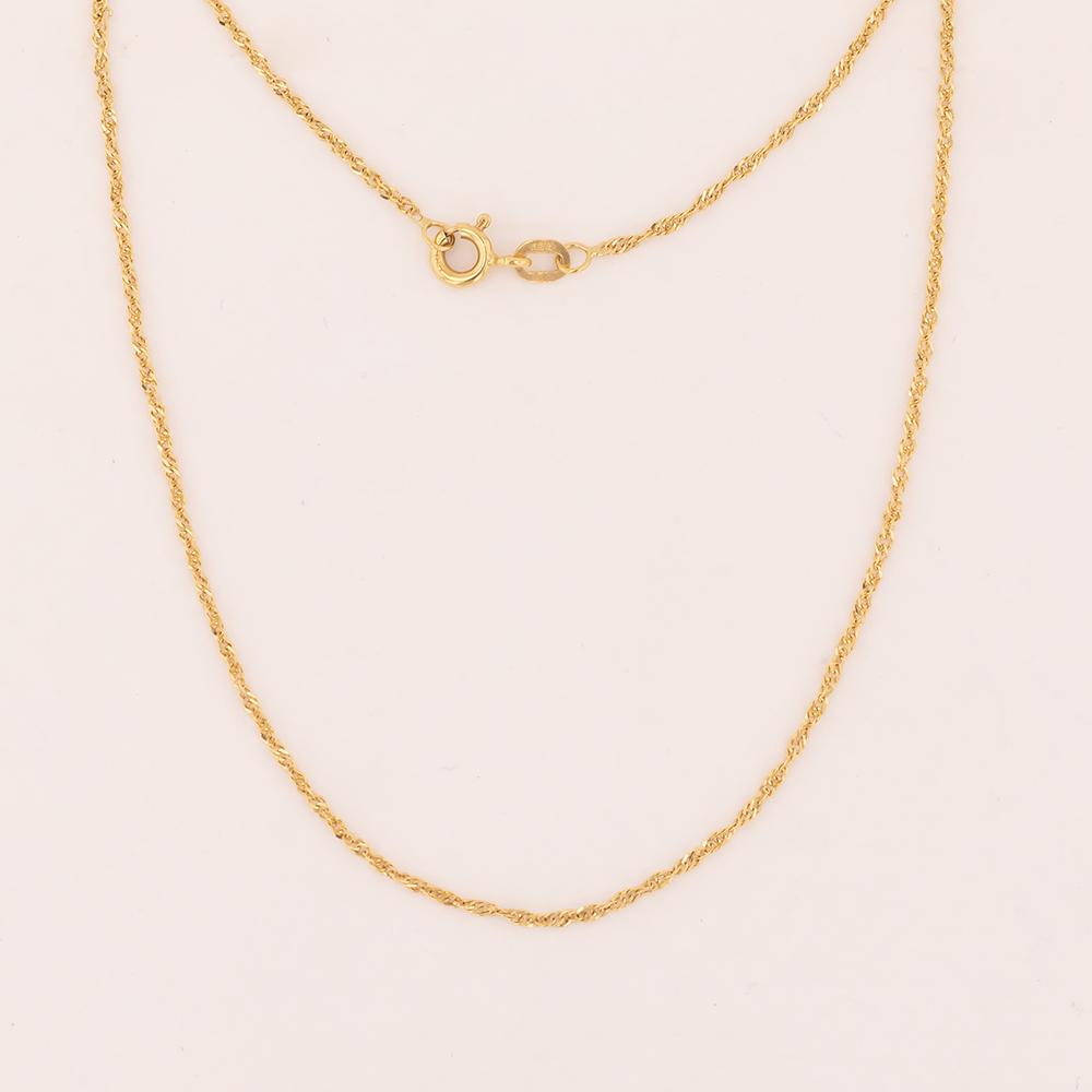 Elegante cadena de oro 18K tipo Singapur de 45 cm, reconocida por su diseño brillante y trenzado que refleja la luz de forma única. Ideal para uso diario o para acompañar dijes finos.