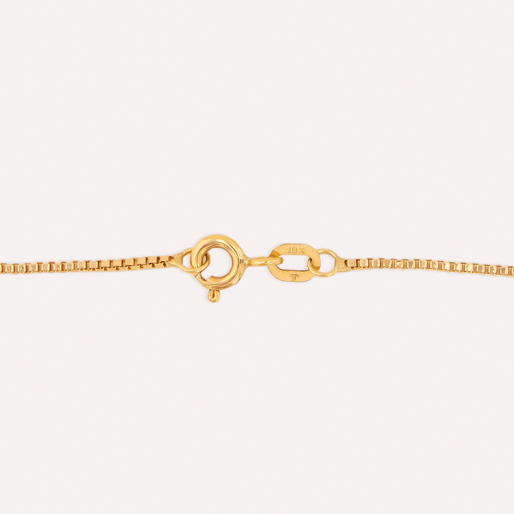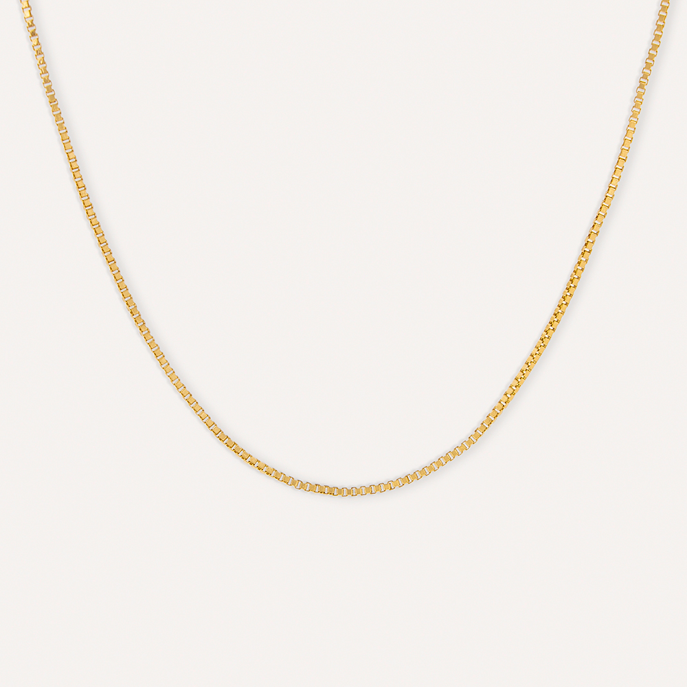 Exclusiva cadena de oro 18K tipo veneciana, reconocida por su diseño de eslabones cuadrados que crean una estructura uniforme, elegante y moderna. Su acabado brillante y su forma compacta la convierten en una pieza ideal para uso diario o para complementar dijes con estilo.