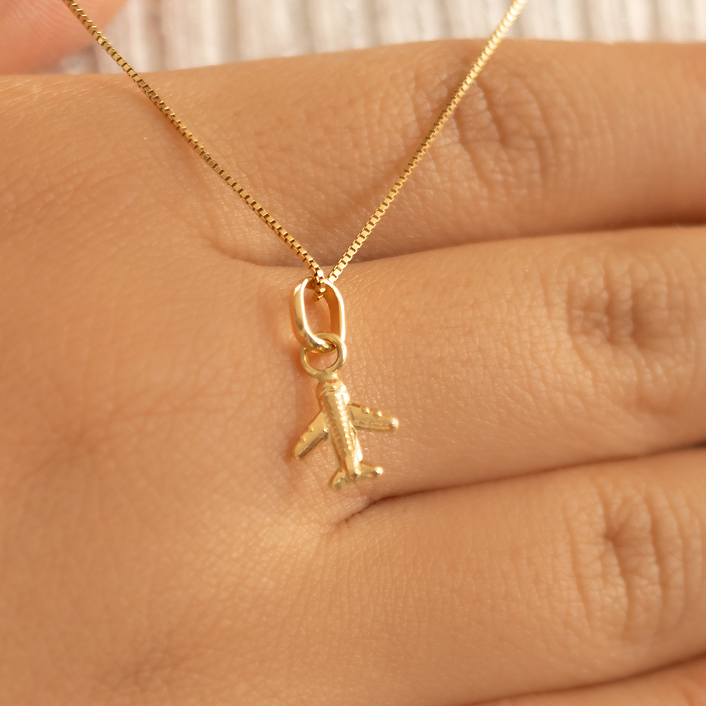 Moderno dije en oro 18k con diseño de avión, perfecto para amantes de los viajes, la aventura y la libertad. Un accesorio único con estilo contemporáneo.
