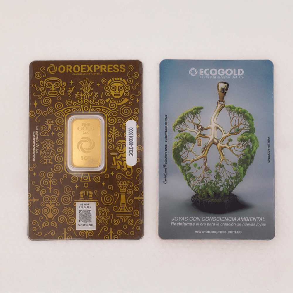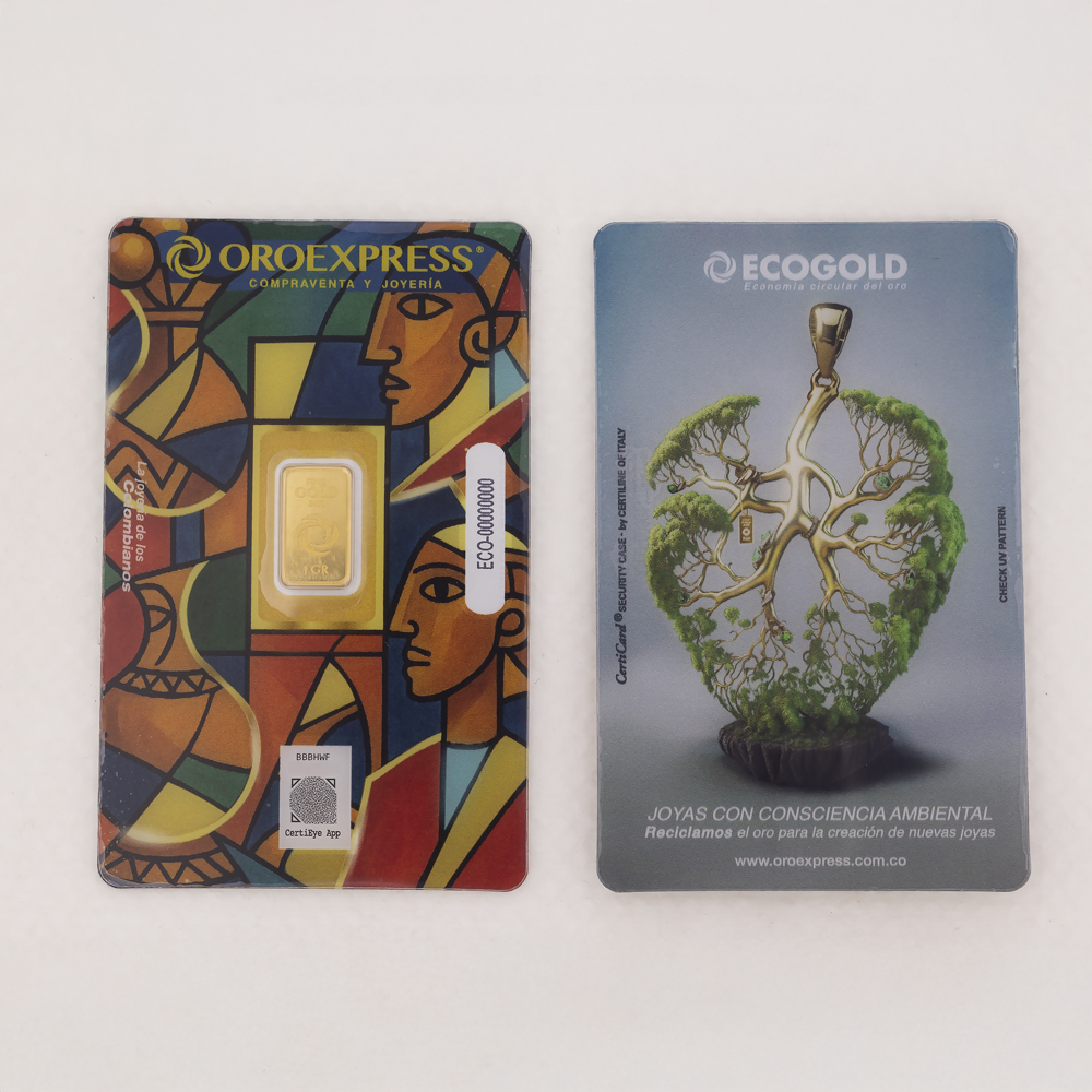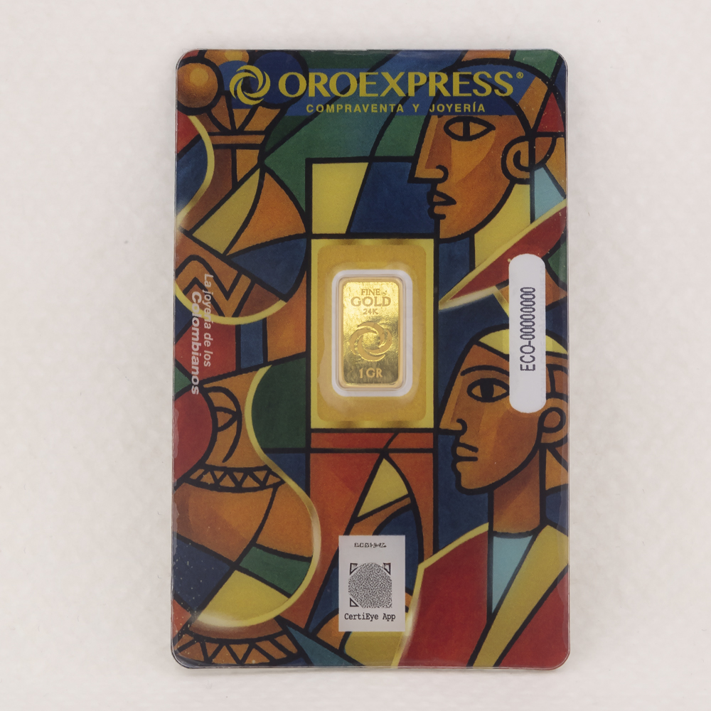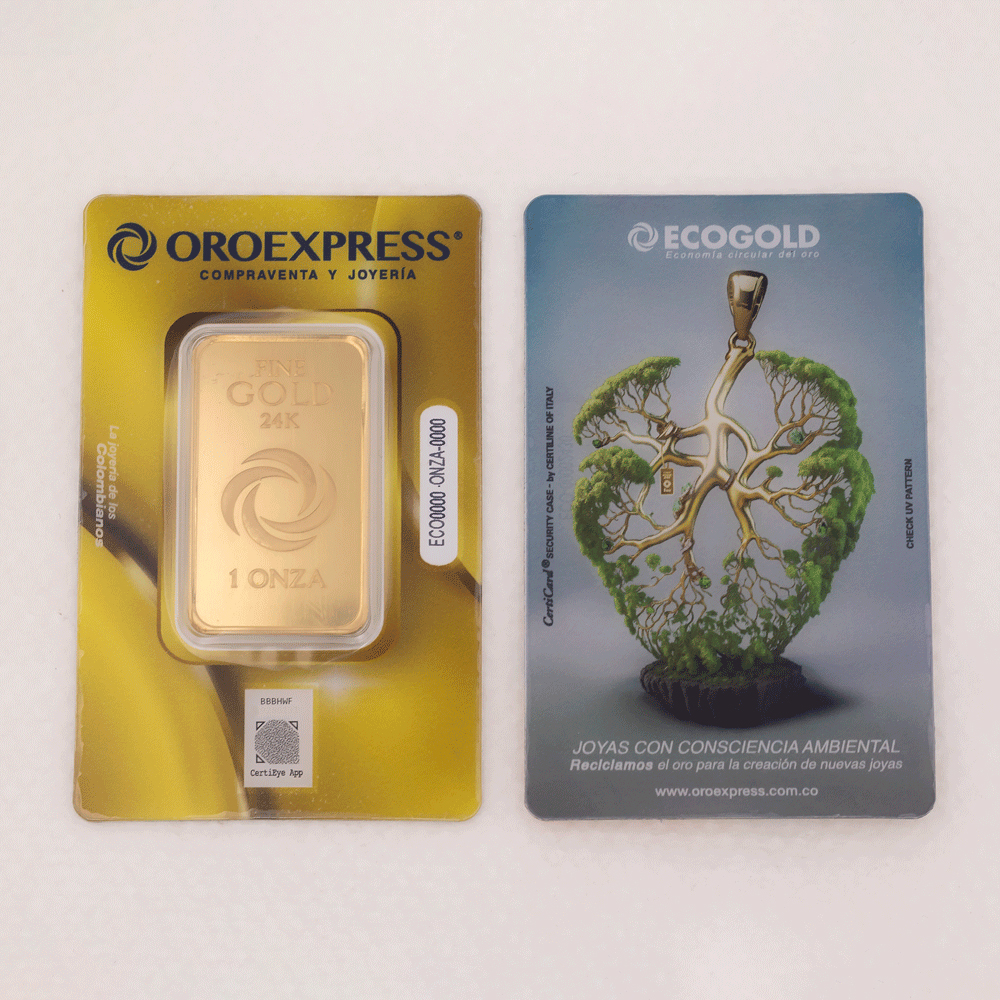 Este lingote de oro de 1 onza, ley 999 (24 quilates), hace parte de una edición de la Fundación Lupines. Lingote de 1 Onza de Oro, con una pureza del 99.99%, pesa aproximadamente 31.1 gramos. Su superficie lisa y brillante lleva grabado el peso, la pureza y el sello del fabricante, garantizando su autenticidad. Alto 41mm, Ancho 24mm, Espesor 2,0mm